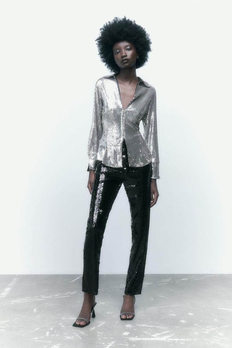 To complete the look, pair the sequinned shirt with this statement Zara Sequin Leggings. These leggings are covered in shimmering silver sequins and feature a figure-hugging fit to create an eye-catching silhouette.